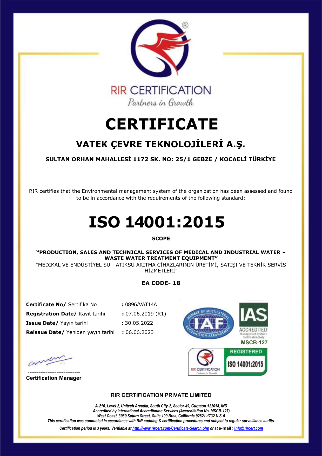 Sertifika ve Belgeler Vatek Çevre Teknolojileri olarak firmamız ve ürünlerimize ait sertifika ve belgelerimizi inceleyebilirsiniz.